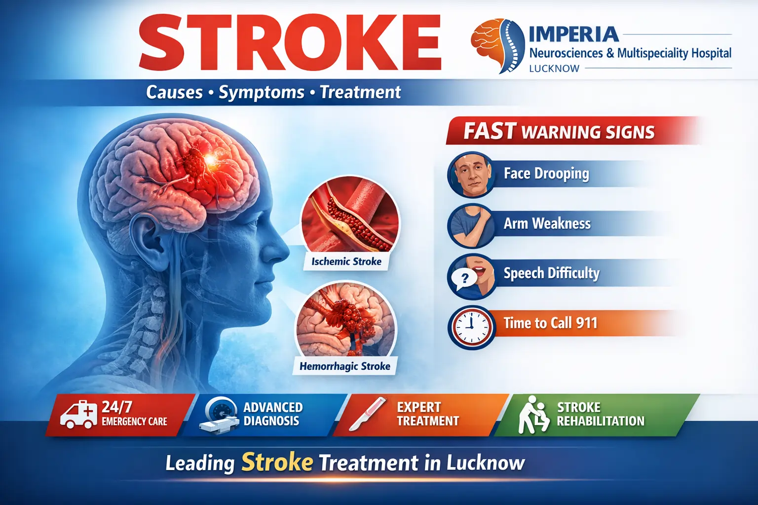 A stroke is a serious medical emergency that occurs when the blood supply to the brain is interrupted or reduced, preventing brain tissue from receiving oxygen and nutrients. Without timely treatment, a stroke can lead to permanent brain damage, disability, or even death. At Imperia Neurosciences and Multispeciality Hospital, Lucknow, we provide advanced and timely stroke care to improve survival rates and long-term recovery.